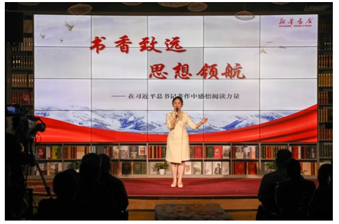 來自山東新華書店集團有限公司棗莊分公司的閱讀推薦人耿月君以《書香致遠 思想領航——在習近平總書記著作中感悟閱讀力量》為題,循著《習近平講故事》《習近平的七年知青歲月》等著作的脈絡,探尋總書記的讀書足跡,汲取奮進前行的力量。